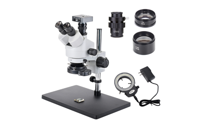 This stereo microscope has a 144-LED ring light that offers super widefield optics and 7X-90X zoom magnification power with a cool light illumination system. It is an ideal instrument for industrial inspection and/or biological lab applications. This microscope is perfect for gemologists , manufacturing engineers, dental lab technicians, and anyone in electronic and semiconductor industries.